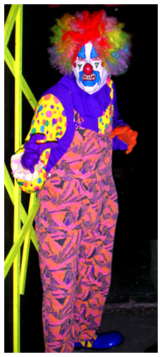 SCARY CLOWN REMAINS A MYSTERIOUS CHARACTER. HE HAS APPEARED AT SOUTHERN CALIFORNIA HAUNTED ATTRACTIONS, INCLUDING THE LEGENDARY (AND NOW DEFUNCT), SPOOKYHOUSE HAUNTED THEME PARK, FANTOM FRIGHT AND FRIGHT FAIR. NEVER TO HEAR A BEEP FROM HIM, THE SCARY ONE TRIES TO LURE THE UNSUSPECTING IN FOR A CLOSER LOOK. EXTENDING HIS HAND AS A GOODWILL GESTURE, HE APPEARS EAGER FOR YOUR FRIENDSHIP. DON'T GET TOO CLOSE OR YOU WILL LEARN HIS "BLAST IS WORSE THAN HIS BITE!" UNPREDICTABLE BY HIS BOISTEROUS NATURE, SCARY CLOWN HAS GOTTEN INTO HIS SHARE OF TROUBLE CALLING FOR A DEPARTURE TO THE MIDWEST, PARTS UNKNOWN!